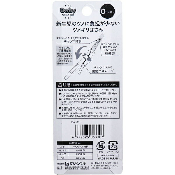 商品特徴一覧baby-heaith、baby、4972525053303、通信販売、通販、販売、買う、購入、お店、売っている、ショッピング【新生児のツメに負担の少ないツメキリはさみ BA-001】広告文責(有)イースクエアTEL:0120-532-772株式会社グリーンベル個装サイズ:60X150X15mm個装重量:約18g内容量:1個入製造国:日本【発売元:グリーンベル】【品質表示】刃部:ステンレス刃物鋼ハンドル・キャップ:ABS樹脂バネ:ステンレス【注意】・使用するときは指をキズつけないように十分にご注意ください。